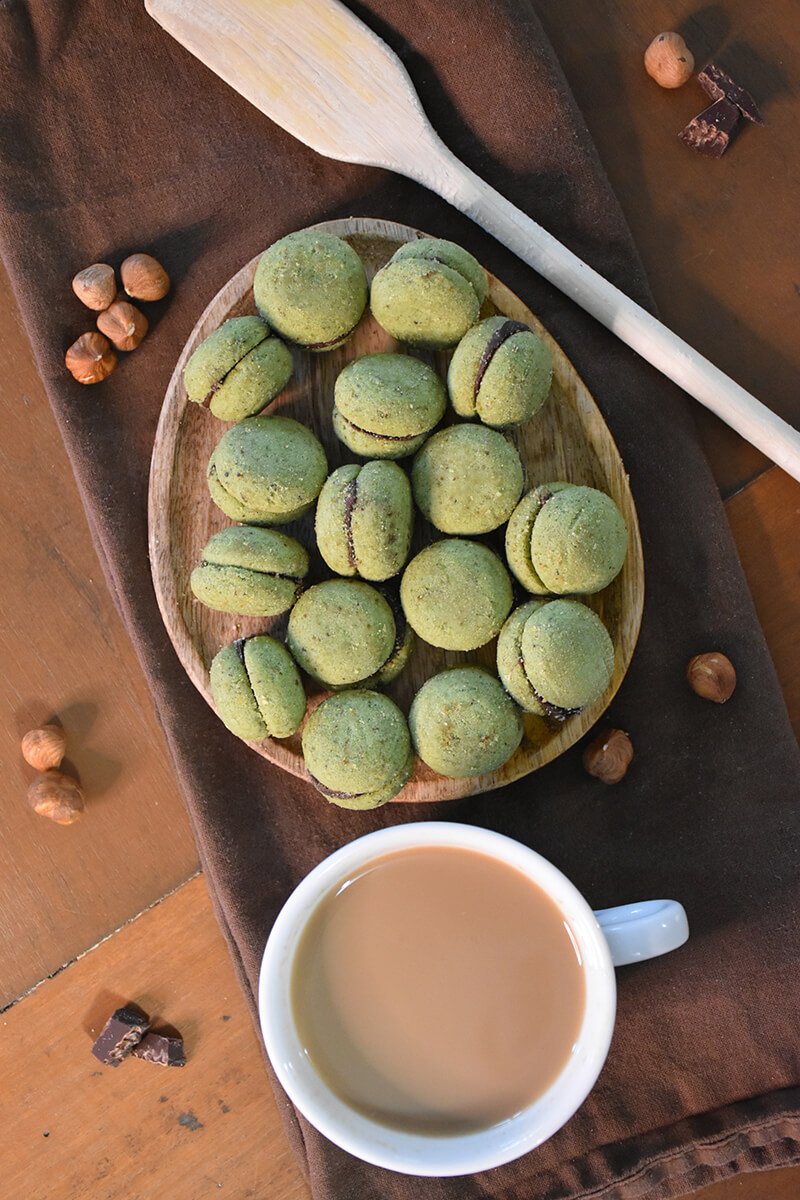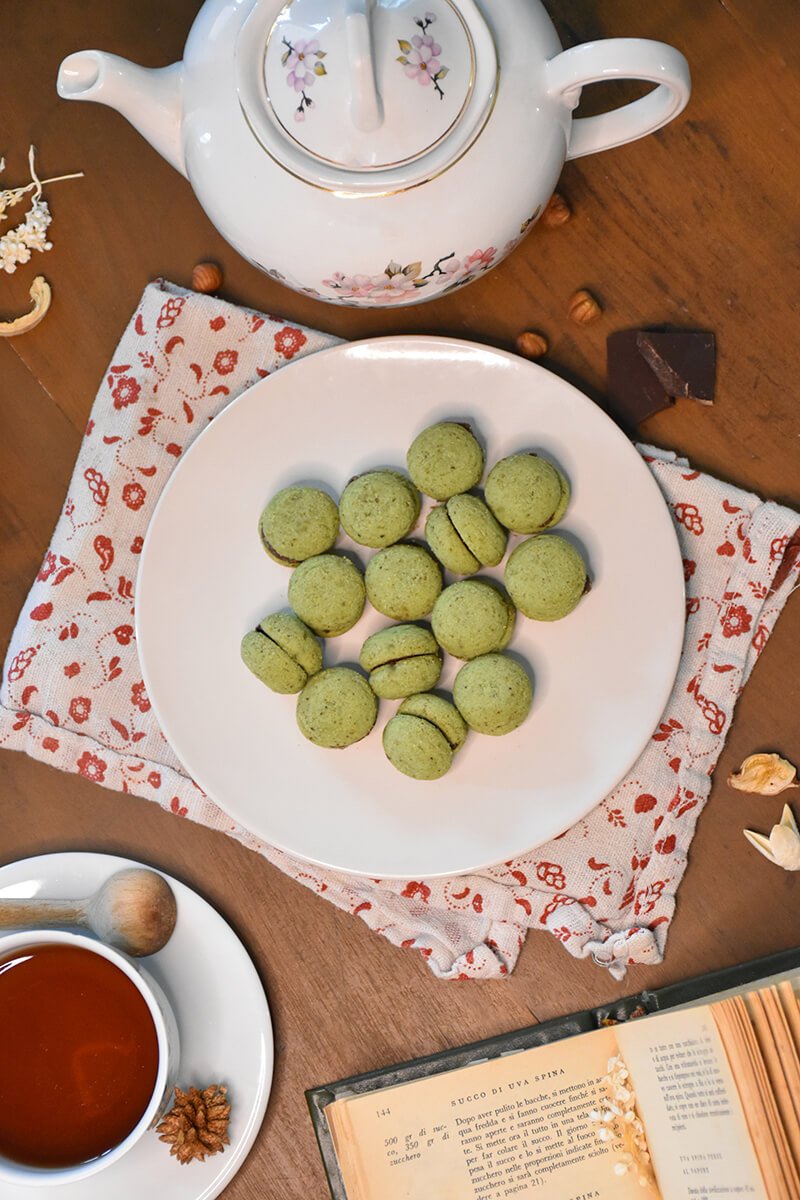Pistachio Baci “00” wheat flour, Butter, Sugar, Pistachio flour 14%, Egg white, Vanilla flavour, Salt, Colouring from vegetable extract: copper chlorophyll (E141). Filling 10%: Dark chocolate 50% (sugar, cocoa paste, cocoa butter, emulsifier: sunflower lecithin (E322), natural vanilla flavour).