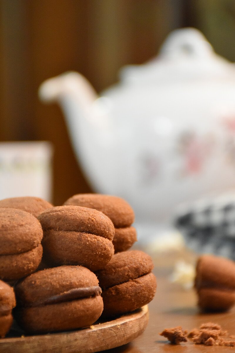 Cocoa Baci “00” wheat flour, Butter 23%, Sugar, Toasted hazelnut flour 14%, Cocoa powder 3%, Wildflower honey, Vanilla flavour, Egg white, Salt. Filling 9%: Dark chocolate 60% (sugar, cocoa paste, cocoa butter, emulsifier: sunflower lecithin (E322), natural vanilla flavour).