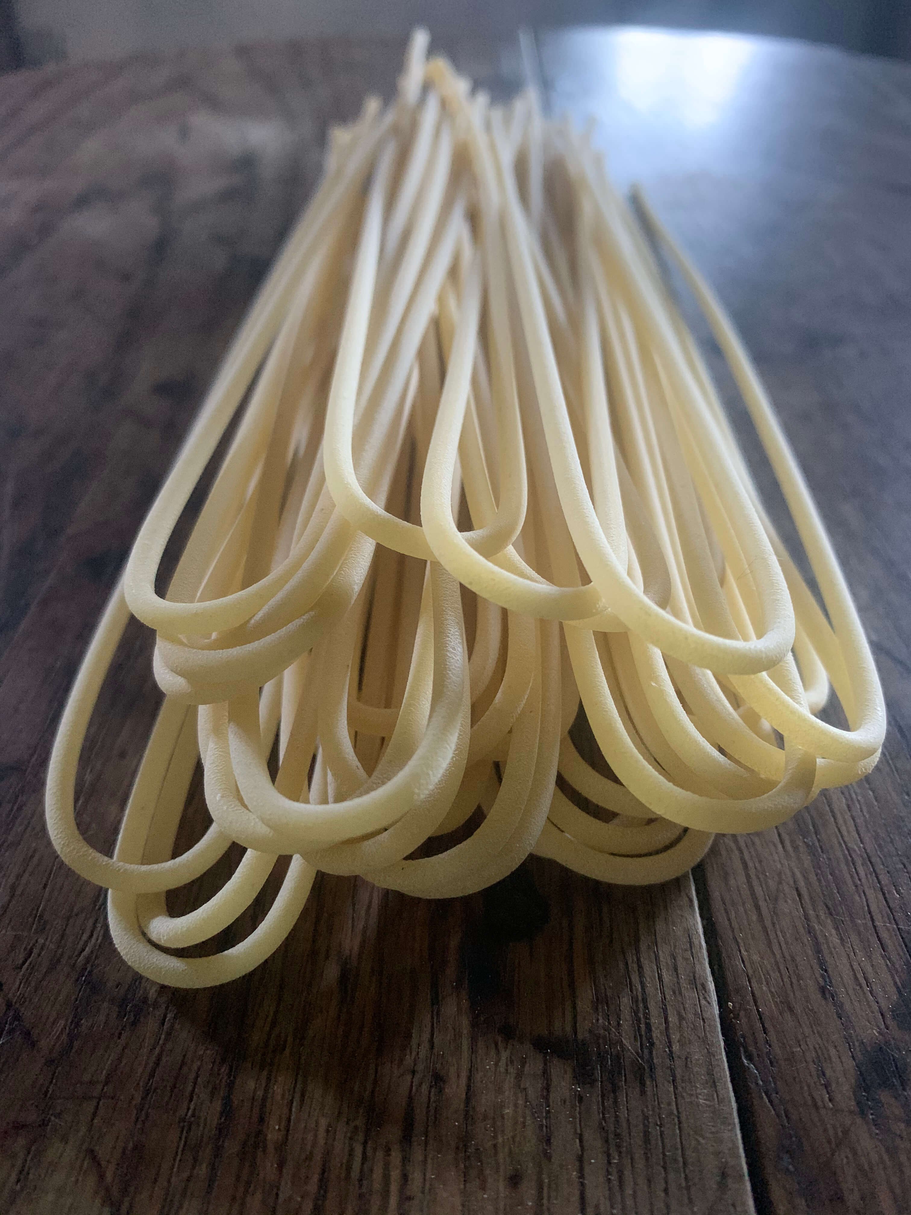 The difference is obvious when our product is compared to mass-produced pasta, extruded in Teflon dies: They are shiny and smooth, which means the sauce can't properly coat the pasta and sinks to the bottom of the plate instead.