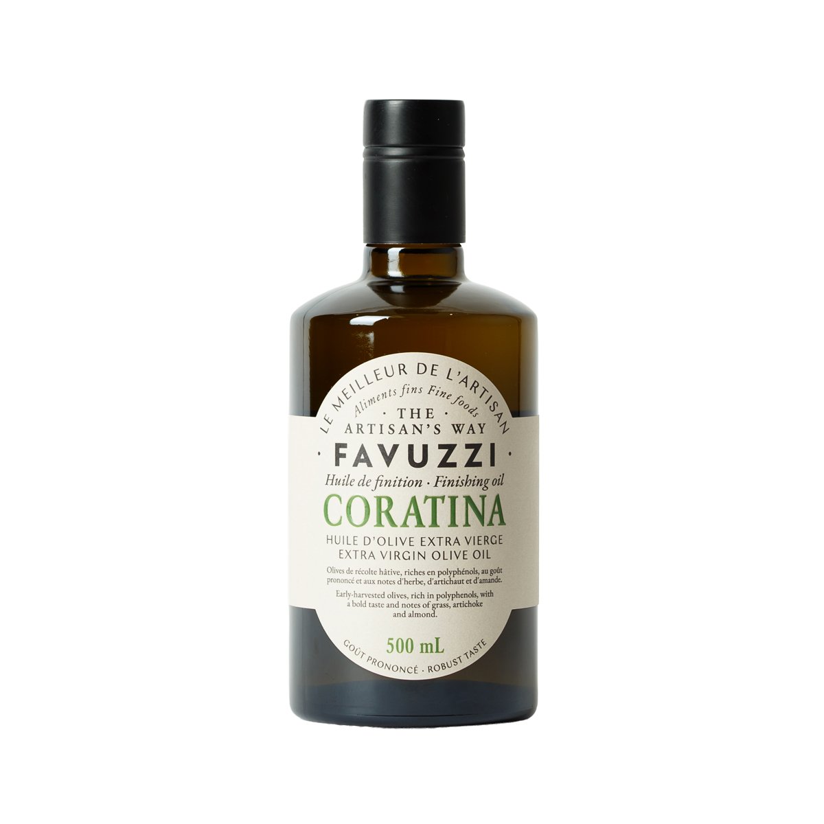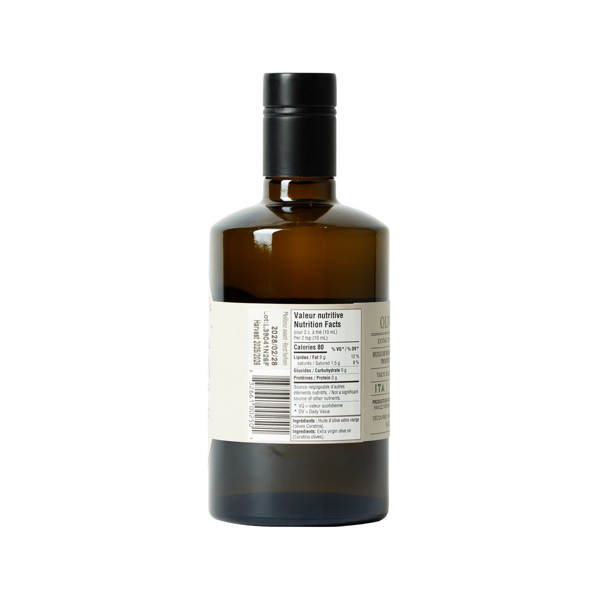 Format: 500 mL. Origin: Puglia, Italy. Olive variety: Coratina. Aromatic intensity: Bold. Use: Finishing olive oil.