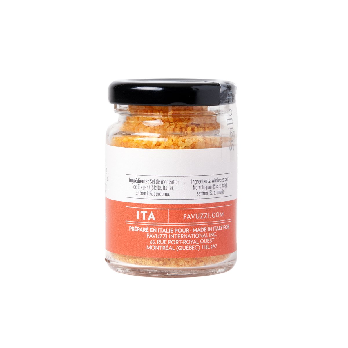 A lovely shade of orange, this blend of large grains of salt and saffron threads features the slightly bitter taste of this precious spice, enhanced with a hint of turmeric.