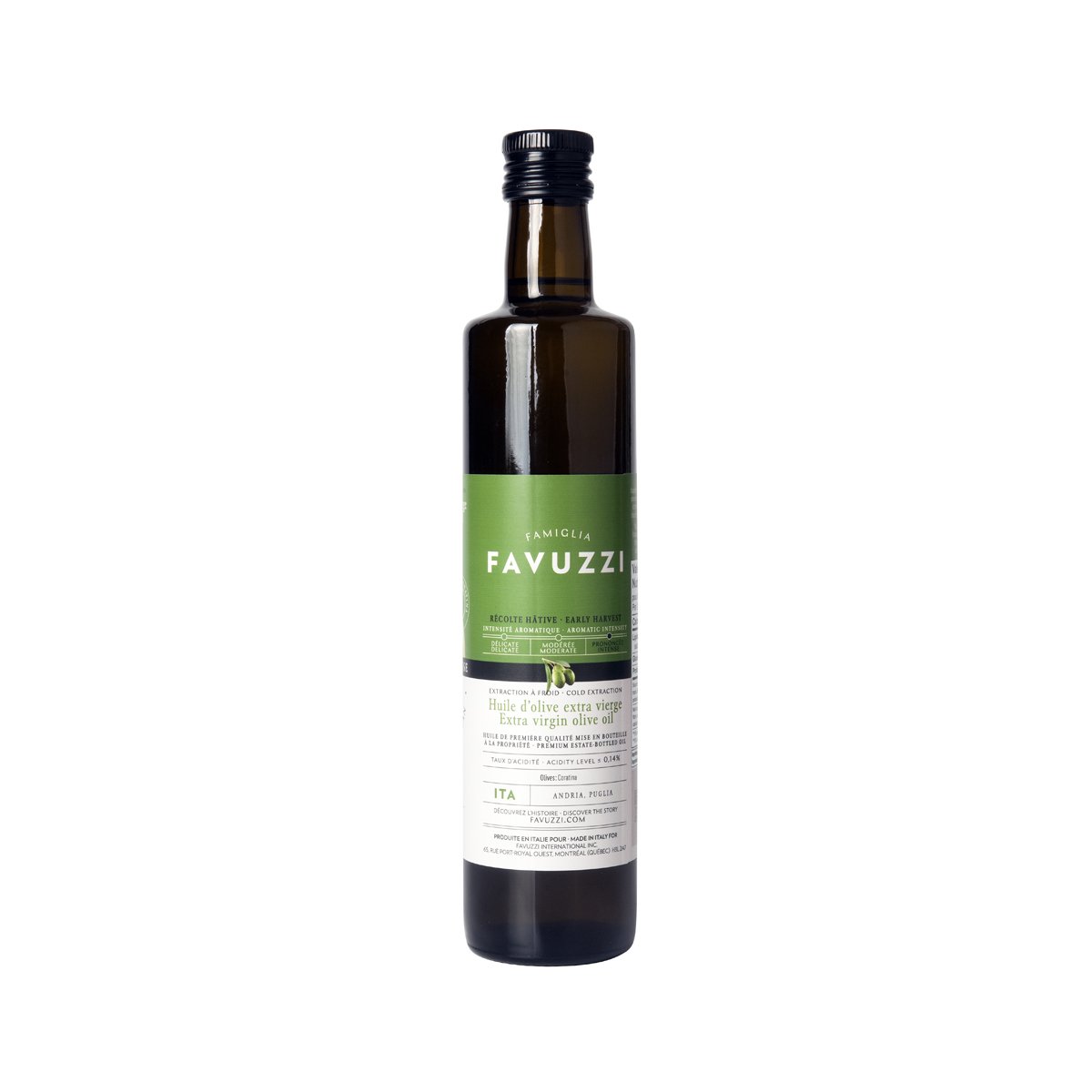 Elle est produite dans la ville d’Andria, près des côtes de la mer Adriatique, dans la région des Pouilles d’où est originaire la famille Favuzzi. Fruit de l’association entre l’expérience de la famille Guglielmi et la technologie la plus évoluée sur le marché, l’huile est extraite dans les heures suivant la récolte, ce qui garantit une huile de qualité d’une fraîcheur incomparable. Les olives Coratina sont cueillies très tôt en saison, alors qu’elles sont toujours vertes. Si elles produisent un volume d’huile peu élevé, elles offrent des propriétés organoleptiques supérieures et sont riches en polyphénols. En effet, la coratina règne au palmarès des variétés d’olives ayant la plus forte teneur en polyphénols au monde.