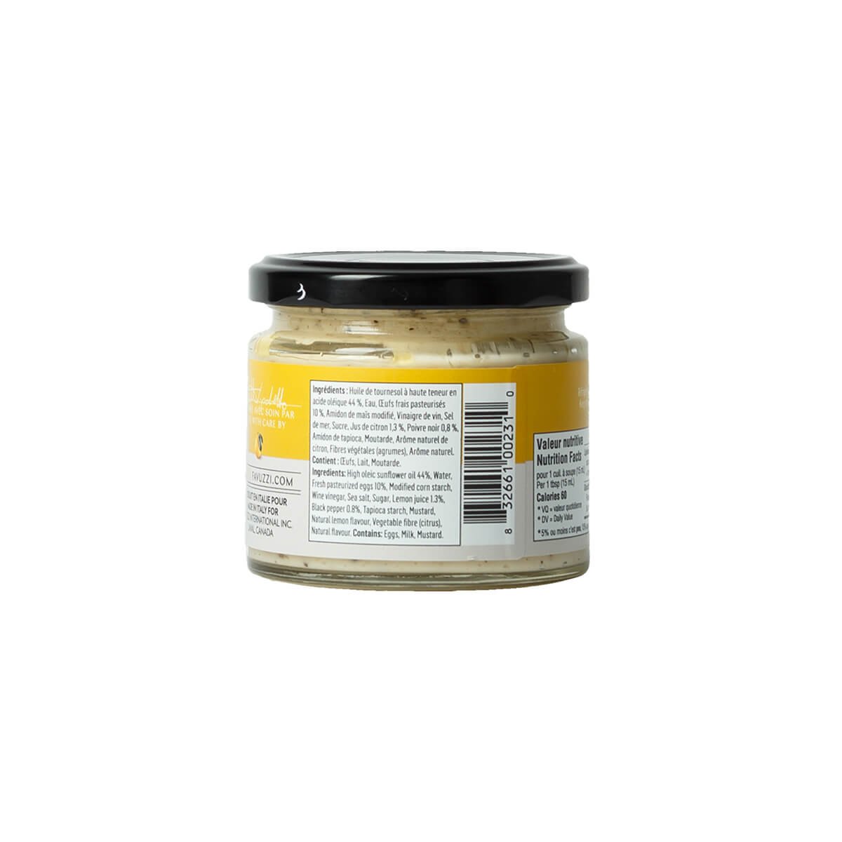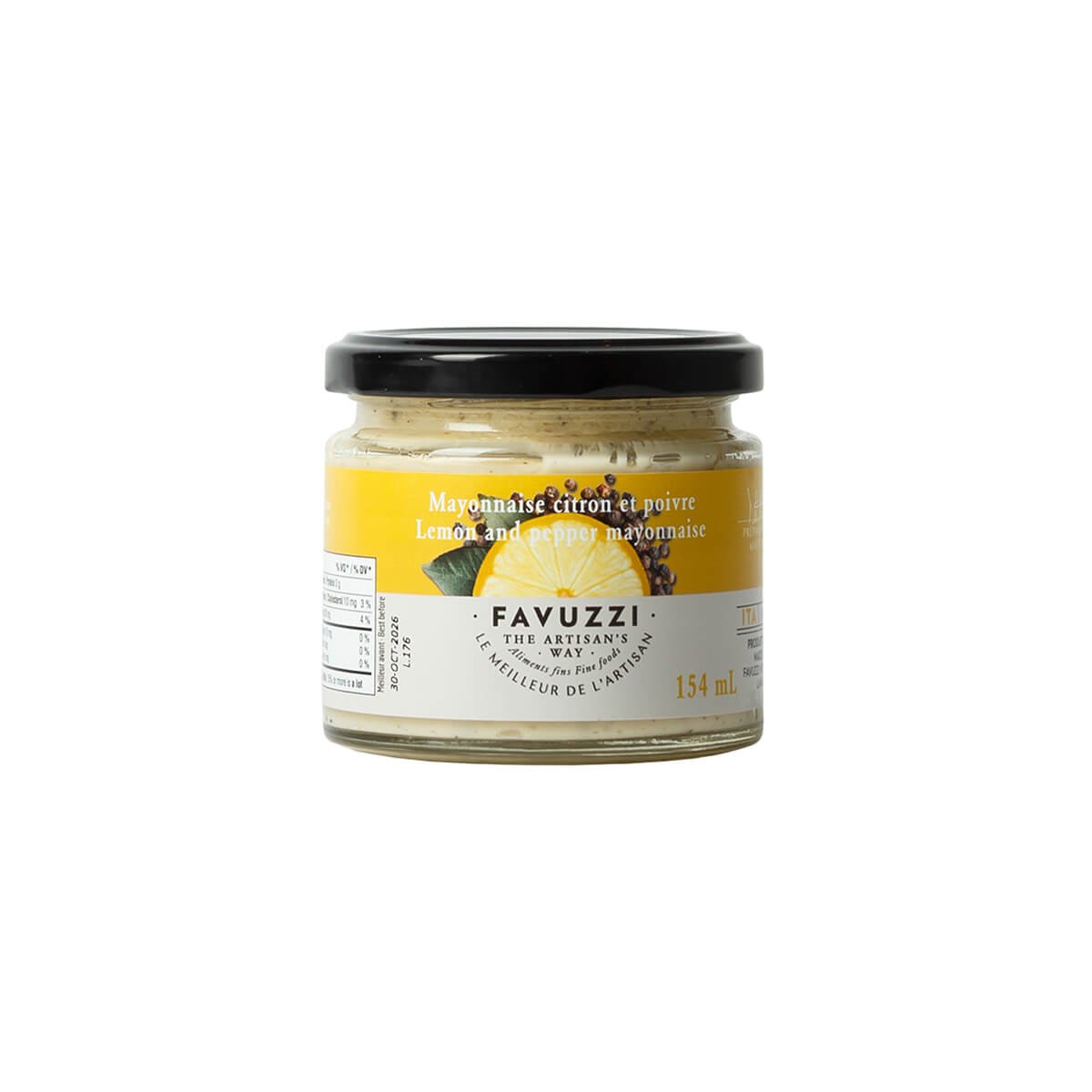 La mayonnaise au citron et poivre noir Favuzzi est un condiment raffiné et onctueux, alliant la vivacité du citron fraîchement pressé de Sicile à la chaleur subtile du poivre noir. Fabriquée en Italie avec des œufs frais pasteurisés et de l’huile de tournesol riche en acide oléique, elle offre un parfait équilibre entre fraîcheur acidulée et piquant délicat. Une revisite éclatante et gourmande de la mayonnaise classique, qui rehausse chaque bouchée avec élégance.