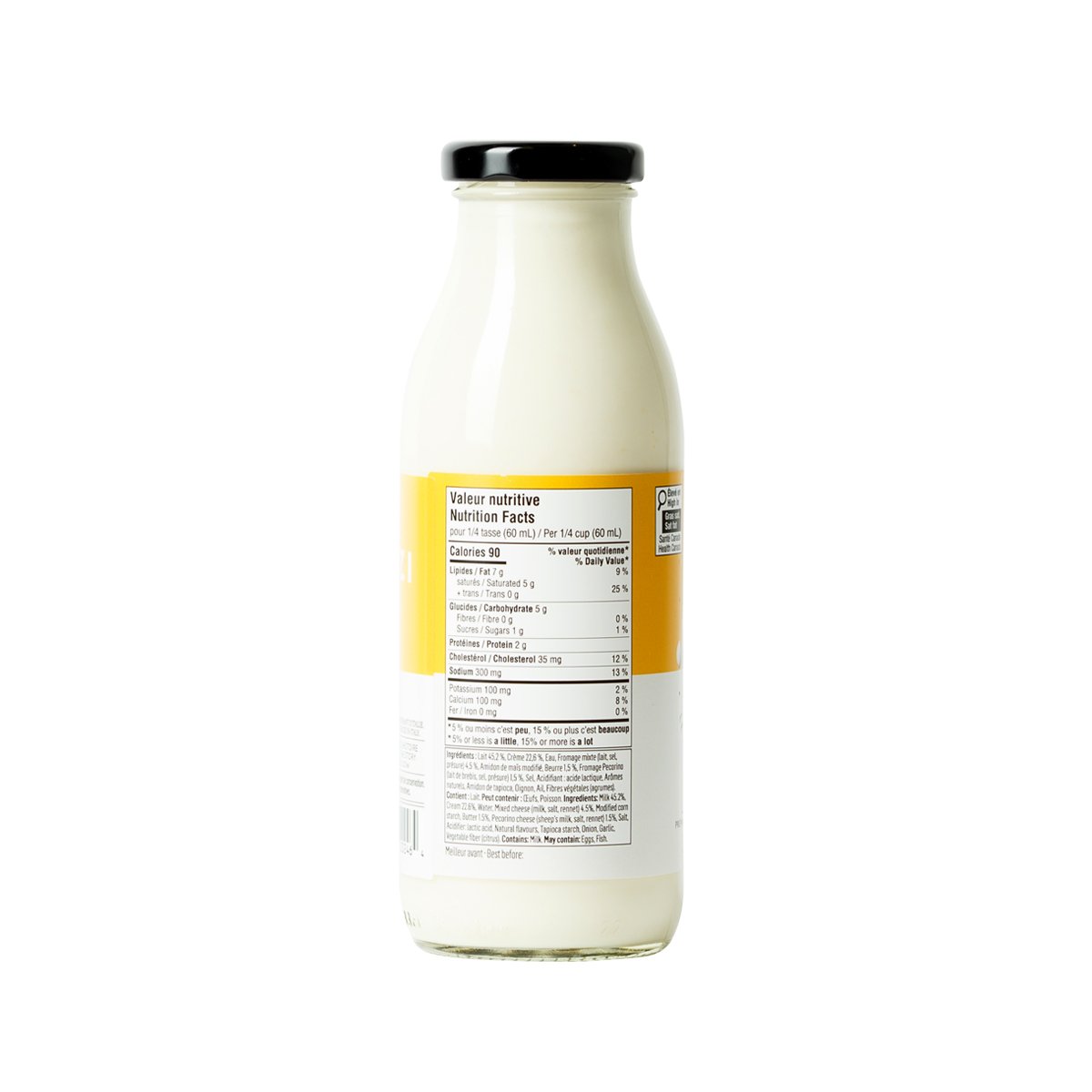 Lait 45.2%, Crème 22.6%, Eau, Fromage mixte (lait,sel,présure) 4.5%, Amidon de mais modifié, Beurre 1.5%, Fromage Pecorino (lait de brebis, sel, présure) 1.5%, Sel, Acidifiant : acide lactique, Arômes naturels, Amidon de tapioca, Oignon, Ail, Fibres végétales (agrumes)