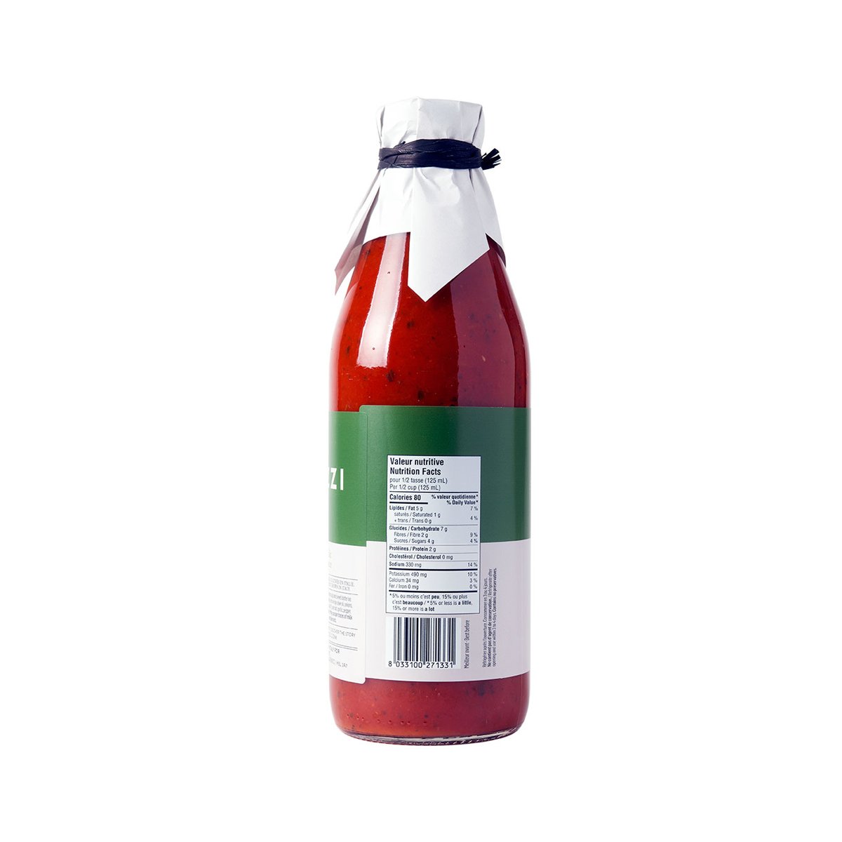 Pulpe de tomates et Purée de tomates cerises 90 % (Italie), Huile d'olive extra vierge, Oignon, Carottes, Céleri, Basilic 1 %, Sel de mer, Ail, Poivre, Acidifiant : acide citrique.