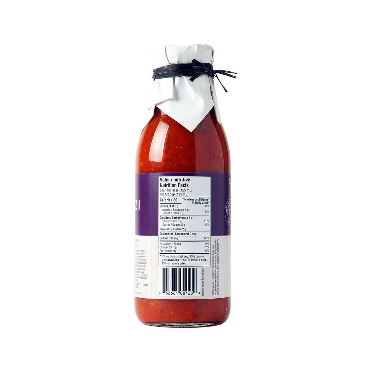 Pulpe de tomates et Purée de tomates cerises 69 % (Italie), Poivrons rouges et jaunes, Oignon, Aubergines, Huile d'olive extra vierge, Ail, Sel de mer, Persil, Origan, Poivre, Acidifiant : acide citrique.