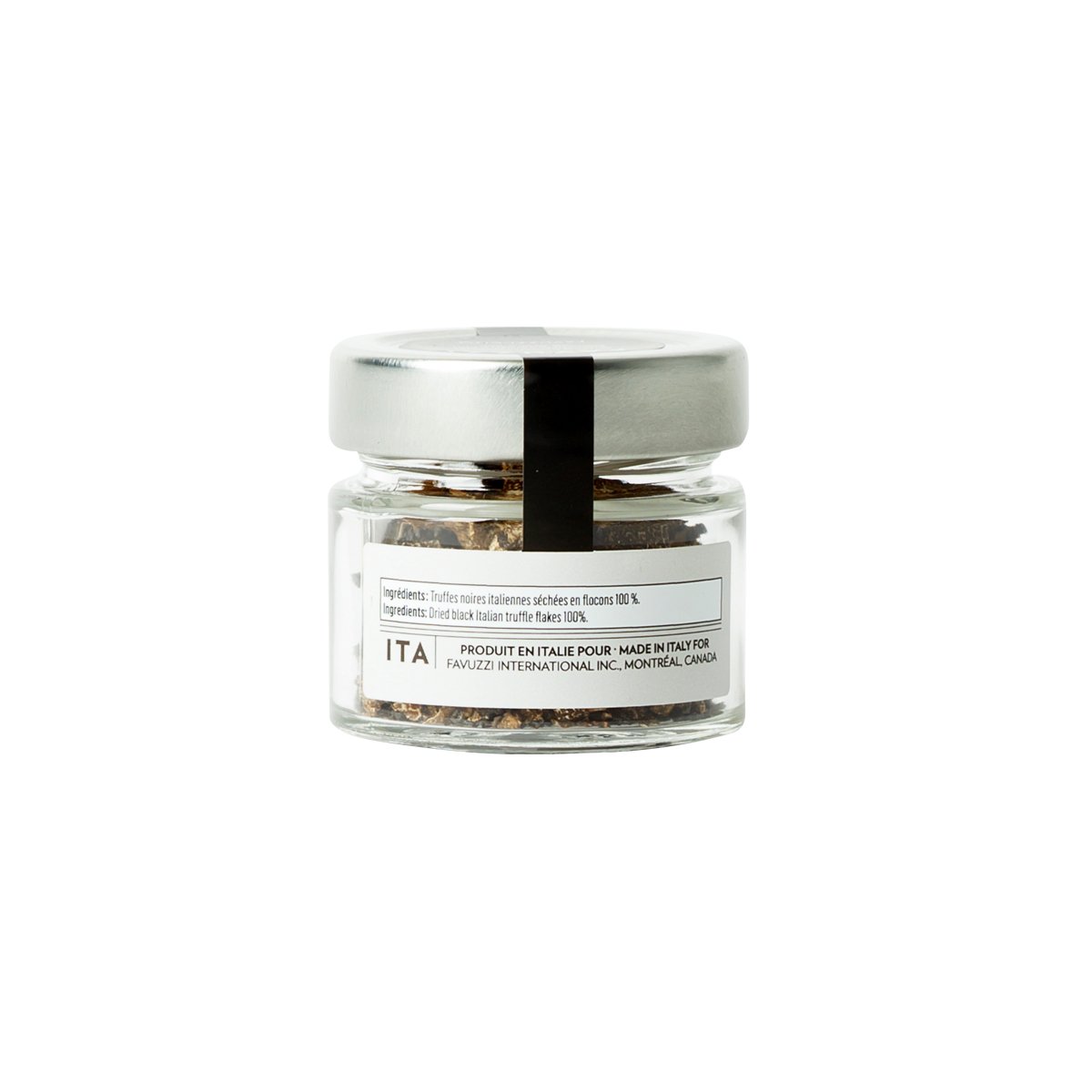 Nos truffes noires – de la variété Tuber æstivum Vitt. – aussi appelées truffes d'été, proviennent de la région des Abruzzes, en Italie. Ces champignons rares, difficiles à cultiver, poussent dans la terre au pied des arbres, comme les chênes et les noisetiers. Pour les trouver, on fait appel à des chiens ou à des cochons qui les flairent grâce à leur odorat développé. Présentes uniquement en Europe pendant une courte période, nos truffes sont cueillies, finement tranchées, puis déshydratées, de sorte qu'elles sont accessibles toute l'année.